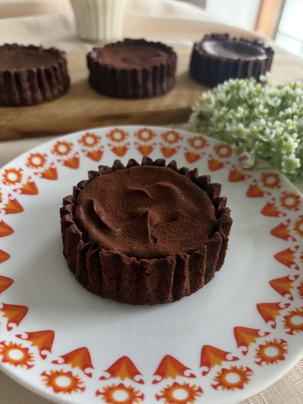 ココア入りのタルト生地に、チョコレートチーズケーキを入れて焼き上げます。仕上げにコーティングチョコで整えれば、とっても美しい仕上がり!