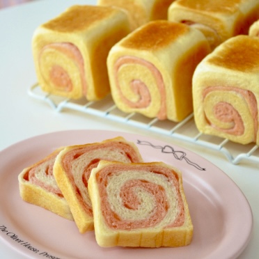 小さなキューブ型を使って、イチゴ生地をマーブルさせたミニ食パンを焼きます。
